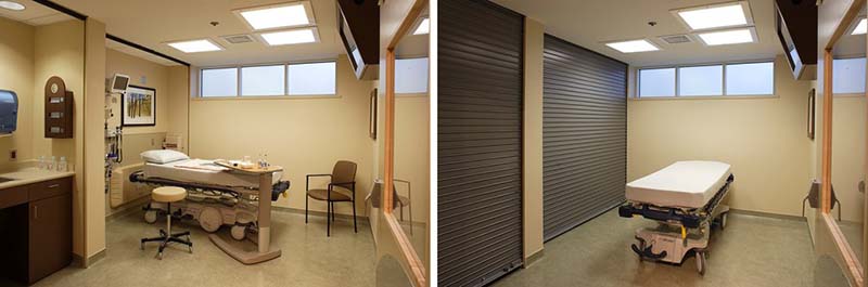 Within the treatment room, one set of locking rolldown doors at the headwall conceals medical gases. A second set of rolldown doors secures the sink and staff work area.