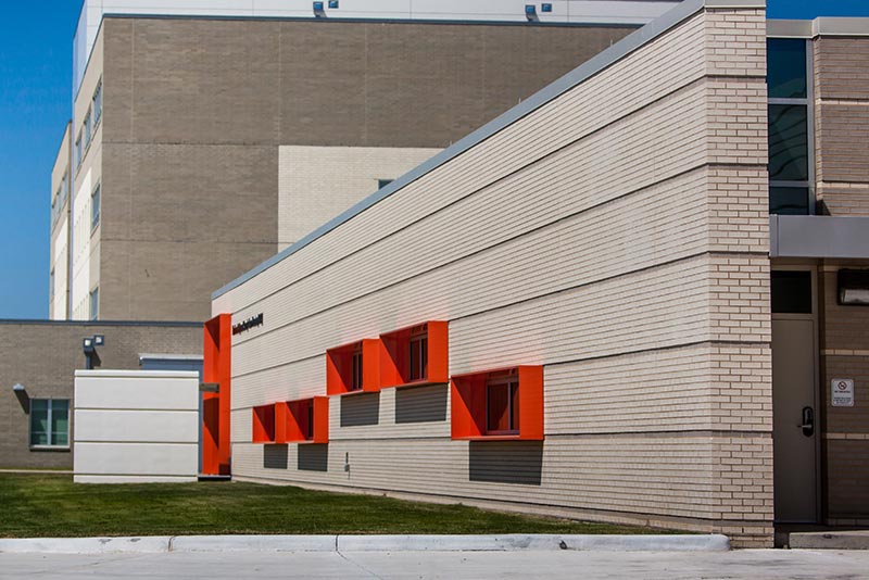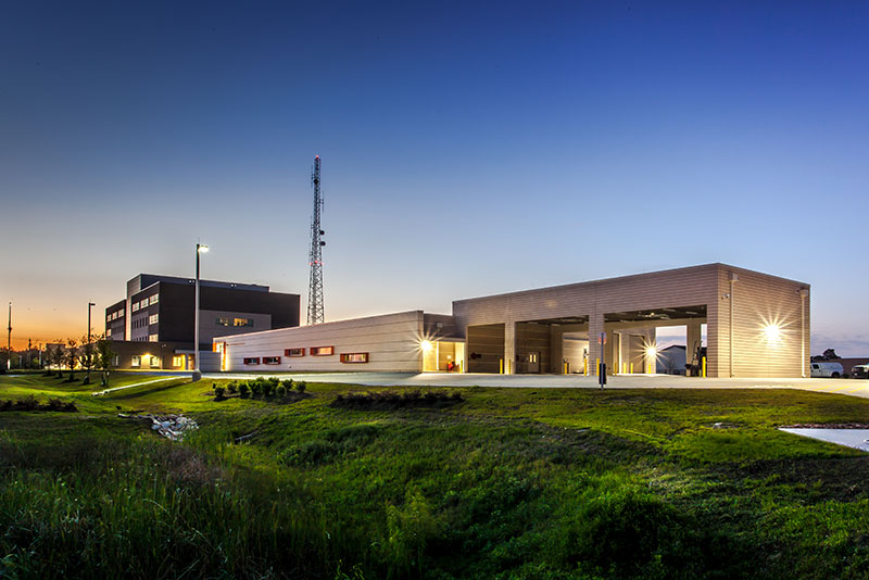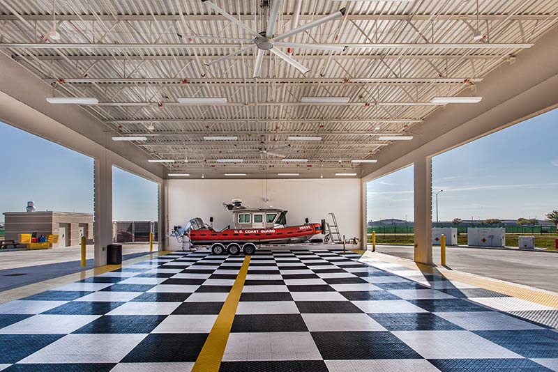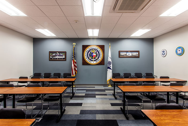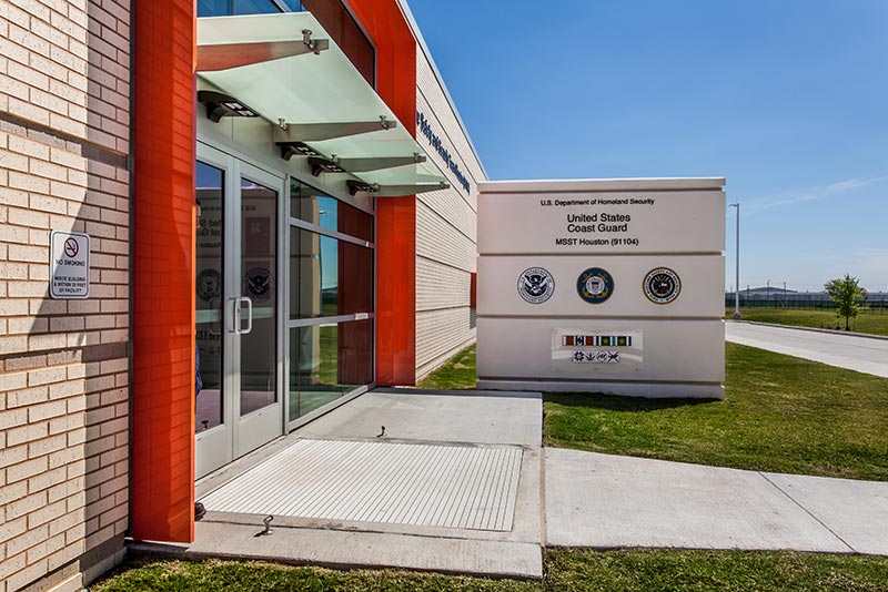 The architectural design for this 27,400-square-foot Houston Maritime Safety and Security Team operations and training facility was carefully considered in terms of its materiality, composition and relationship to the existing campus. It was important that the MSST building relate visually to the campus while also representing the user group it housed. Horizontal white and gray brick bands were in harmony with the masonry on the existing adjacent building and U.S. Coast Guard heraldry was also incorporated in the custom designed metal panel window surrounds on the main building elevation. These four-sided surrounds formed a decorative cowling that was not only visually stunning but also provided shade on the south facing windows. They metaphorically represent the red-ringed boats deployed at sea.