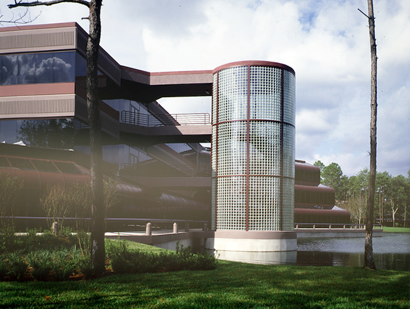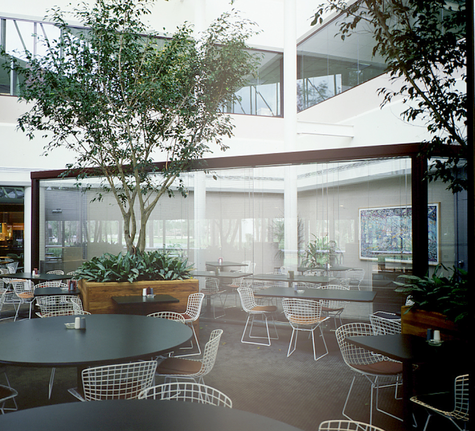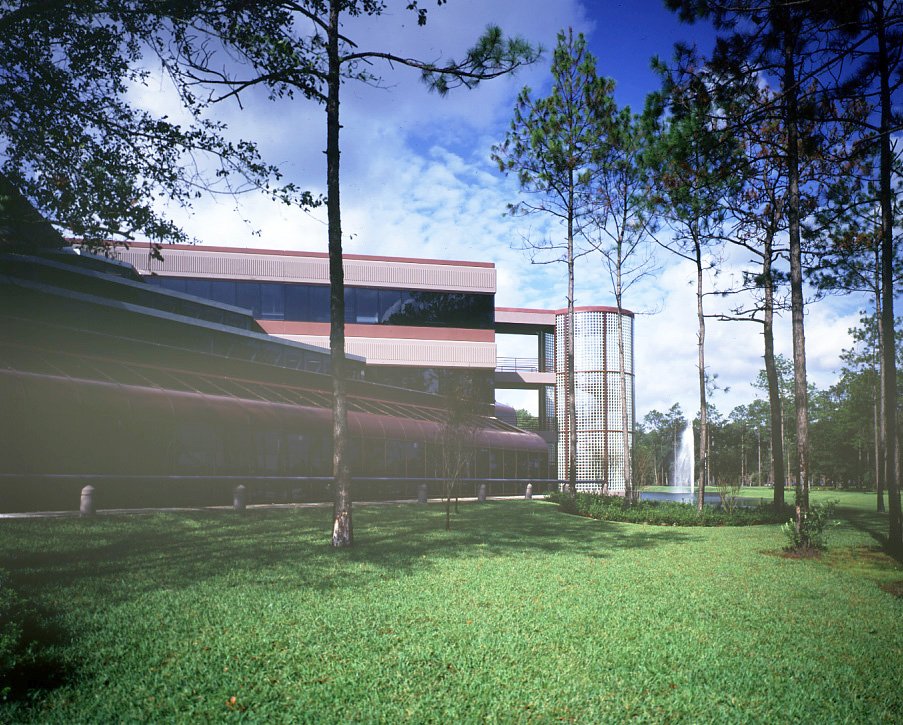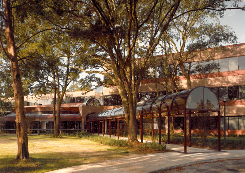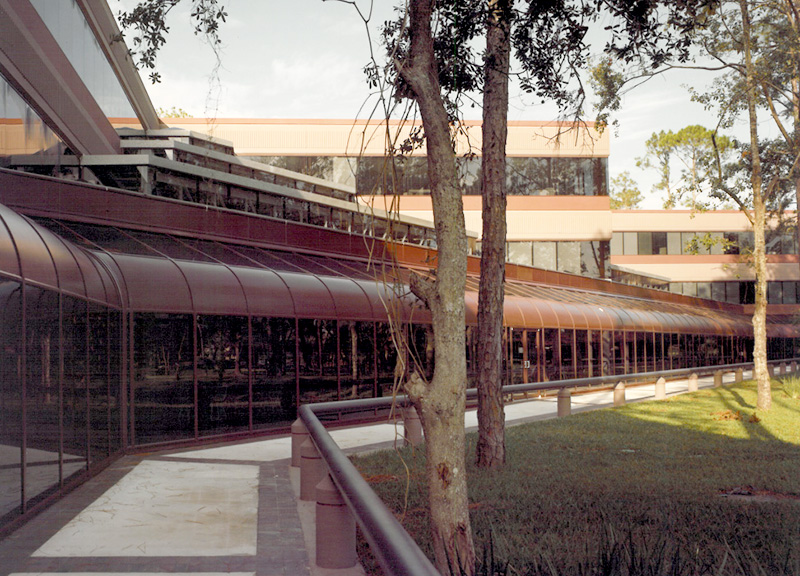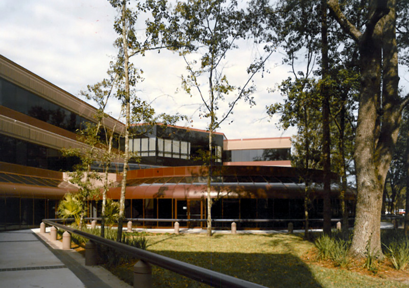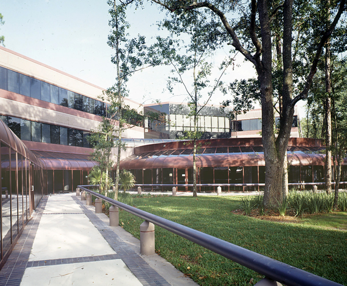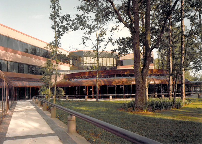 The headquarters incorporated forward-thinking features for flexibility and sustainability. In-floor ducts provided streamlined delivery of power, phone and data to workstations and computer systems, supporting the client’s growing technological needs. A heat-recovery system captured and recycled computer-generated heat for reuse in occupied spaces, reducing energy demand. The 27-acre site featured a five-acre lake and provided parking for 1,450 employees, creating a campus environment that supported both functionality and employee experience.