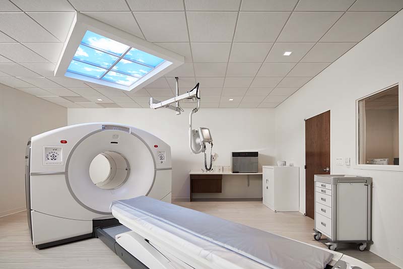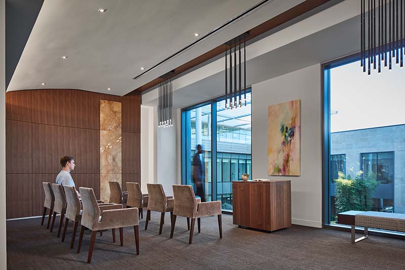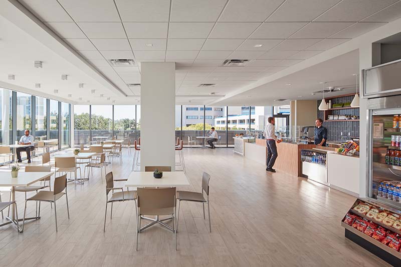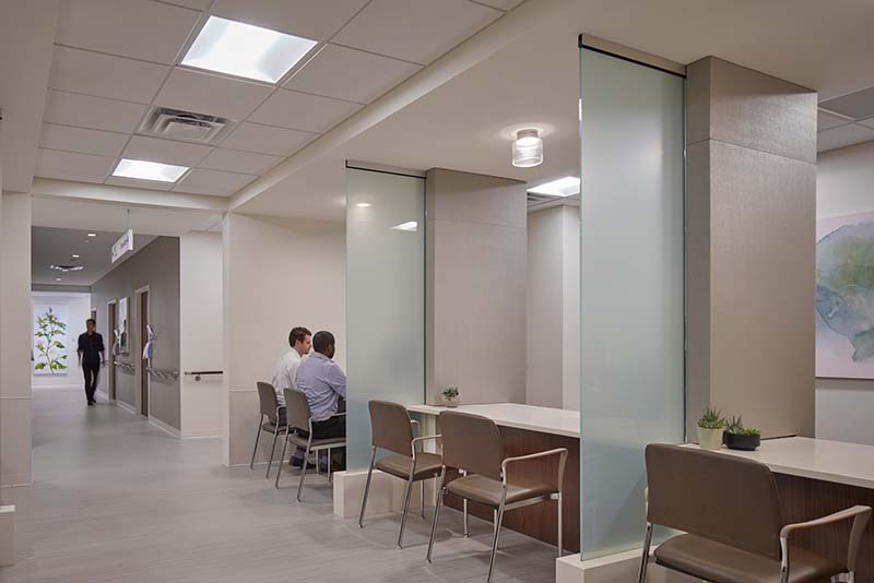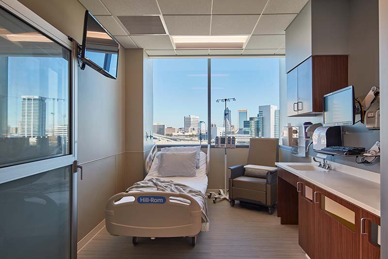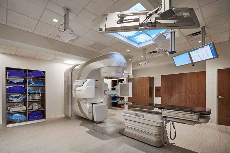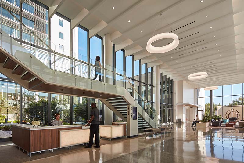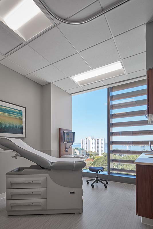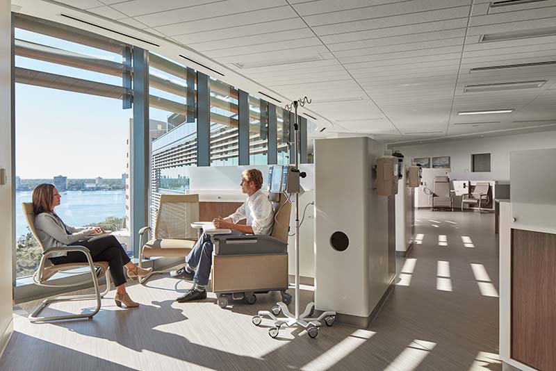 A total of 57 infusion stations, both private and semi-private, are located on the top level of the facility, with beautiful views of the St. Johns River and the surrounding Jacksonville area. Additionally, the project has large outpatient clinics for medical and surgical oncology, two linear accelerators with provision for a third in the future, diagnostic imaging, stat lab, infusion therapy and infusion pharmacy, support services, conference center, faculty offices and work area, and numerous amenities including a cafe, chapel, boutique, and outside courtyard and terraces. The two-story lobby is a marquee space with access to a large, landscaped courtyard that serves as the key organizational element of the building.