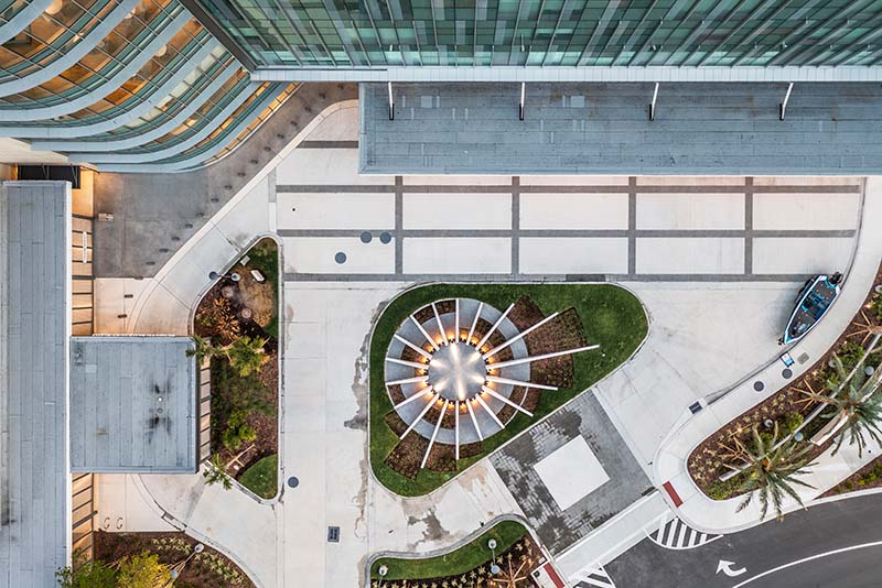 The arrival court is designed to enhance the arrival experience for patients and families, can accommodate four lanes of vehicles, and offers a major entry canopy framed by the landscaped plaza. The project includes the relocation of major subsurface utilities and the demolition of the old, existing P2 parking structure. This project and the new P2 parking structure create a new face for the Downtown Campus. An elevated pedestrian bridge spans Palm Avenue connecting the P2 parking structure to the new building.
