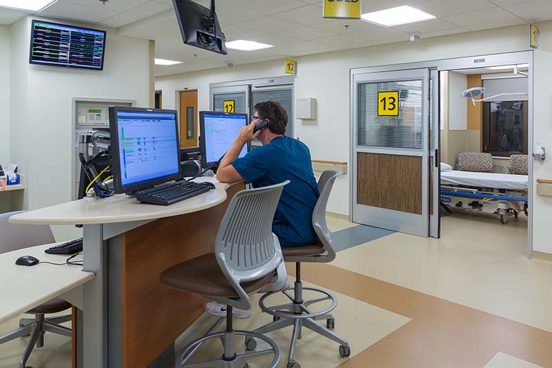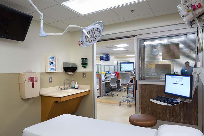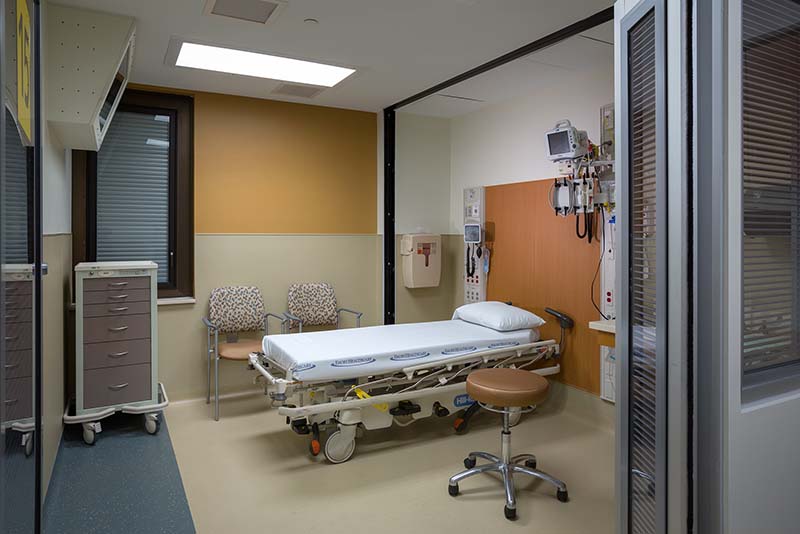 Imagine trying to take a loved one to the emergency department and having to blow your horn through a tangle of valet parking! The existing ED entrance was inside the hospital’s front door, and one of the first design challenges our team addressed was providing a dedicated walk-in emergency entrance. Additionally, the elevated arrival deck for ambulance traffic was expanded in response to increasing traffic and the size and weight of transport vehicles.