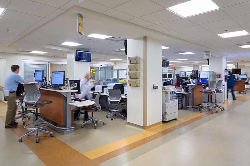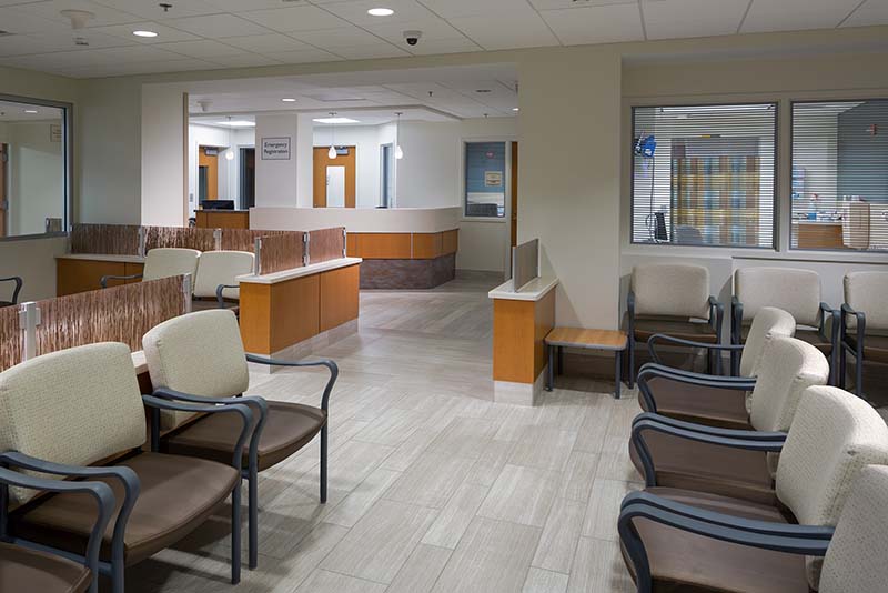 Emory’s patient population is older and often presents with higher acuity and admission rates. Together with the facility’s physical layout, these patient demographics caused bottlenecks of patients receiving or awaiting treatment and admission. Primary project objectives included improving care delivery by alleviating severe space constraints and creating capacity for a projected patient increase. While the amount of waiting space was expanded, the overall patient introduction process changed to incorporate immediate triage assessment and a more ordered CIA. Portions of the ED were renovated in place, remaining operational during construction, while others were renovated for lab functions.