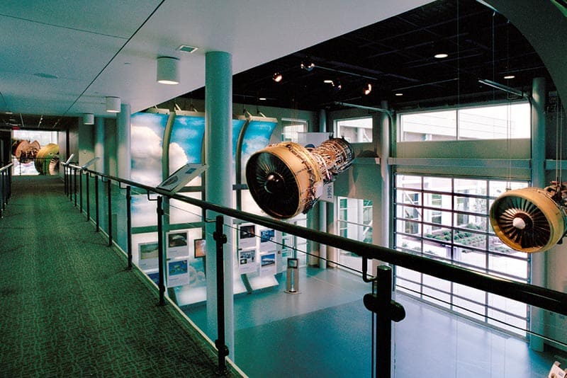 The new two-story learning center welcomes customers, visitors and employees both inside and out. Giant compressor engine blade replicas sweep toward the sky above while, underneath, visitors enter the engine display area. The unique corporate facility — comprised of precast concrete panels and masonry and steel construction — also features a 400-seat auditorium, learning rooms, business center and display areas.