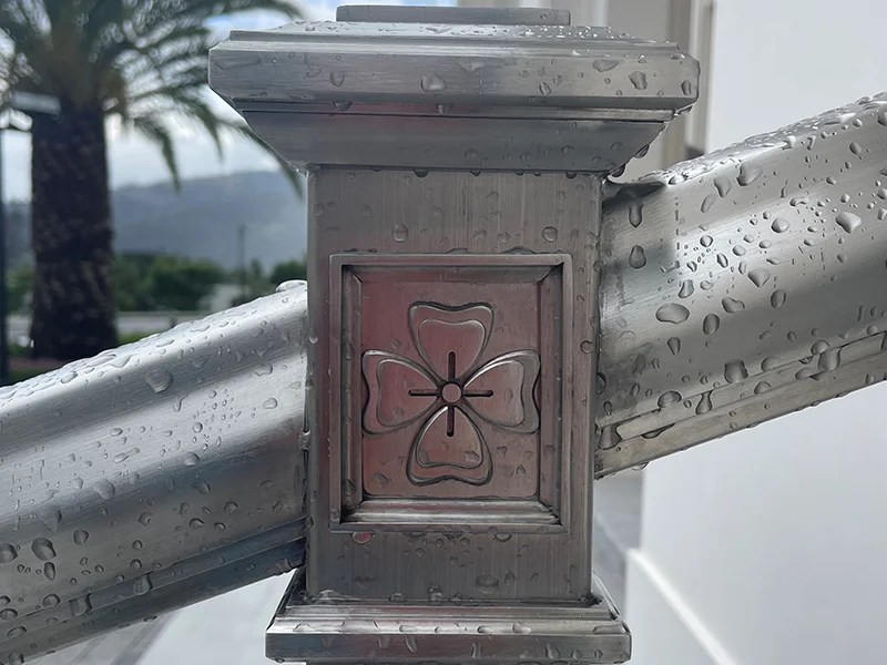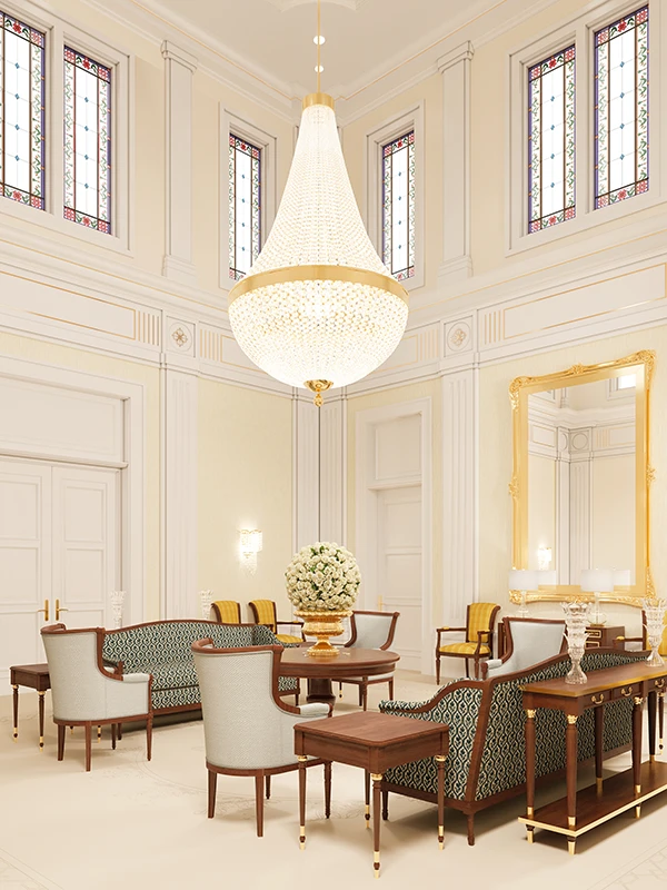 The temple’s exterior blends local craftsmanship with enduring materials. Cast-in-place concrete walls and floors are paired with Turkish limestone cladding and decorative carved stone panels above the windows. Volcanic andesite stone at the base conveys solidity, while locally sourced stained glass incorporates abstract floral patterns and colors native to Ecuador. The central fountain, also crafted by local artisans, is covered in natural andesite stone etched with Ecuadorian floral motifs. Even in the interior design, local heritage is honored, with the geranium—a favorite flower in Ecuador—appearing in decorative details throughout.